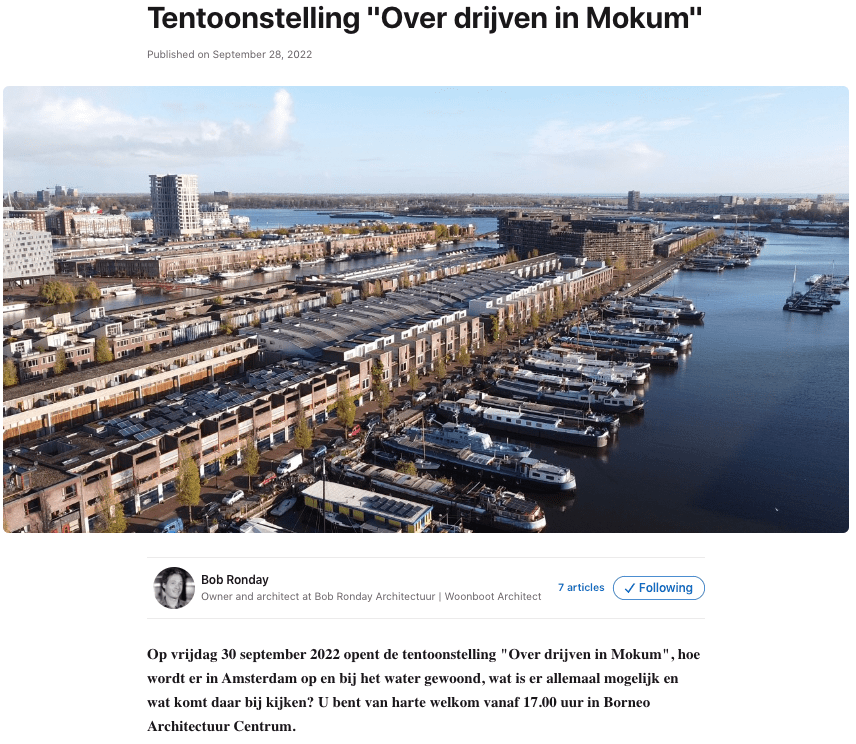 Locatie: Borneo Architectuur Centrum Amsterdam30 september 2022 tot 31 maart 2023 Opening tentoonstelling “Over Drijven in Mokum” vijdag 30 september 2022 om 17:00 uur, hoe wordt er in Amsterdam op en bij het water gewoond, wat is er allemaal mogelijk en wat komt daar bij kijken. In deze tentoonstelling brengen we in kaart hoe er inMeer lezen over “Over drijven in Mokum”