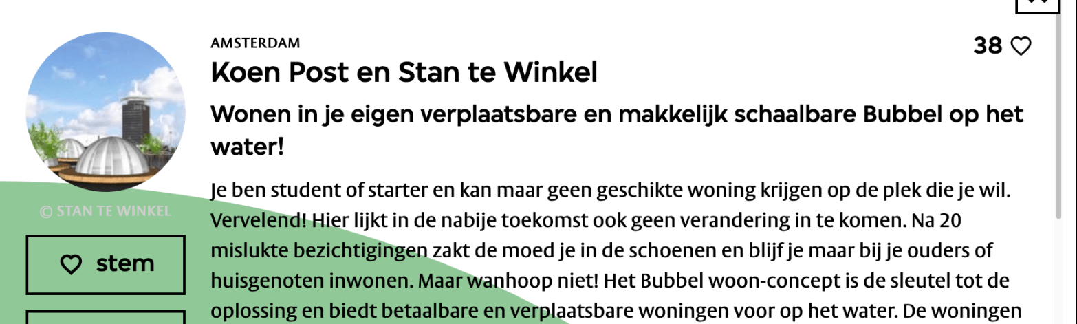Koen Post en Stan te Winkel Wonen in je eigen verplaatsbare en makkelijk schaalbare Bubbel op het water! Je ben student of starter en kan maar geen geschikte woning krijgen op de plek die je wil. Vervelend! Hier lijkt in de nabije toekomst ook geen verandering in te komen. Na 20 mislukte bezichtigingen zakt deMeer lezen over “Stem op ze!”